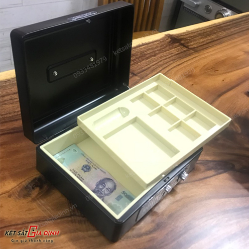 – Hộp đựng tiền mật mã 668 có 1 quai xách di động, bên trong có 1 khay nhựa chia ngăn để nữ trang.