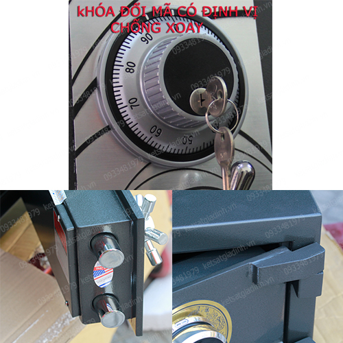 + Hệ thống chốt Inox liên hoàn xuyên sâu vào thân két khi đóng cửa – với 4 chốt Inox phi 32mm vô cùng chắc chắn khi cửa đóng.