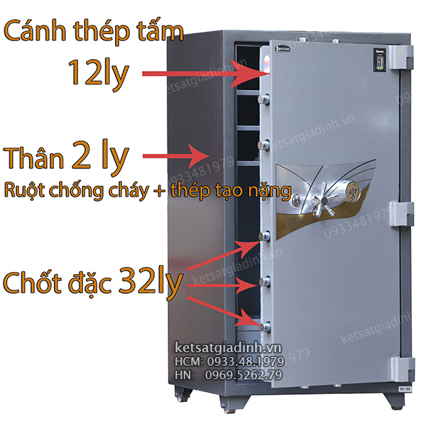 • Cánh cửa két sử dụng thép Carbon nguyên tấm dày 12mm, đạt chuẩn JIS Nhật Bản, mang lại độ cứng cao, chống cạy phá, khoan cắt hiệu quả.