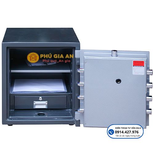 - Thân két được chế tạo từ hai lớp thép mạ điện GA, kết hợp với đá, thép hạt và vật liệu cách nhiệt có khả năng chịu nhiệt cao, đồng thời đảm bảo tính chống đục phá vượt trội.