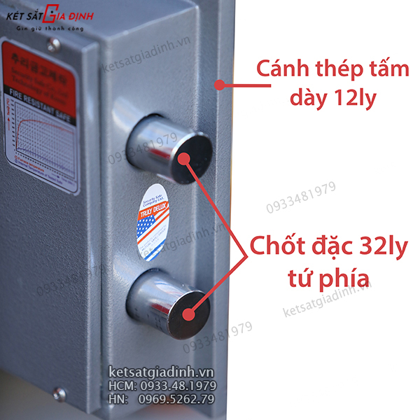 - Cách đóng két: Cầm tay nắm, đẩy cửa đóng và xoay qua phải, sau đó xoay khóa chìa ngược chiều kim đồng hồ.