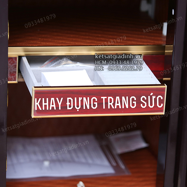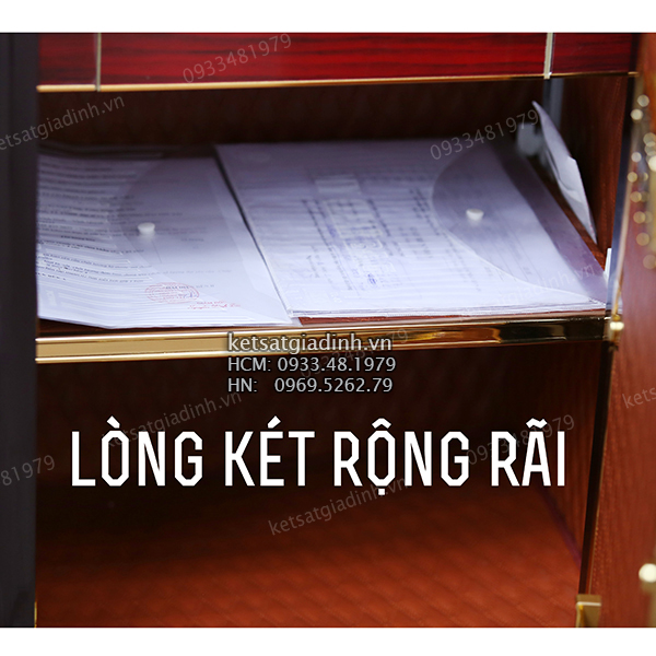 • Khoang chứa 5 ngăn lớn, phù hợp cất giấy tờ, tiền bạc, vật có giá trị . Hộc kéo bọc nhung dành riêng cho trang sức 1 đợt chia ngăn di động . Ngăn hầm bí mật ở đáy két, sử dụng khóa chìa cơ riêng