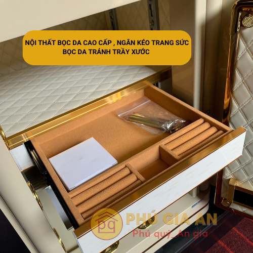 - Hệ thống ngăn: 2 ngăn lớn, rộng rãi để lưu trữ giấy tờ, tiền mặt và tài sản có giá trị. Hộc kéo bọc nhung chuyên dụng cho trang sức.