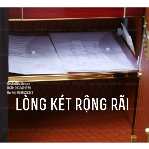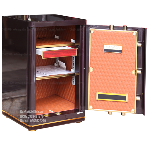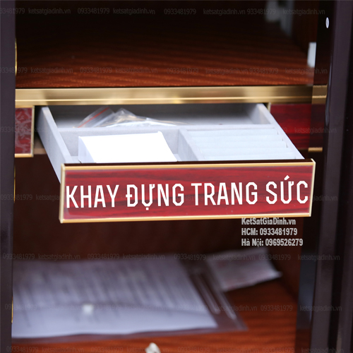 - Hệ thống ngăn: 2 ngăn lớn, rộng rãi để lưu trữ giấy tờ, tiền mặt và tài sản có giá trị. Hộc kéo bọc nhung chuyên dụng cho trang sức.