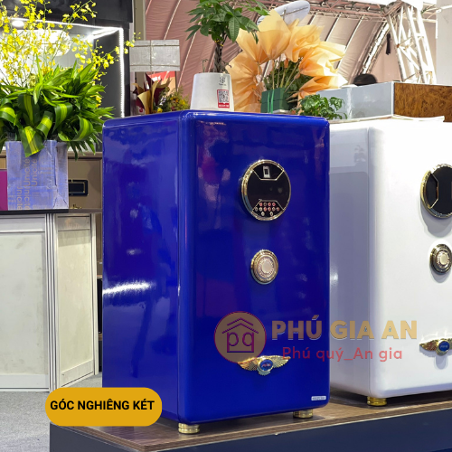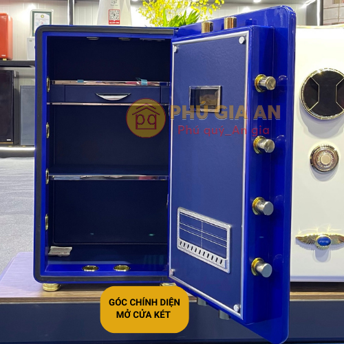 • Hệ thống khóa mở két: Kim loại mạ vàng và kính cường lực, chốt khóa inox nguyên khối.