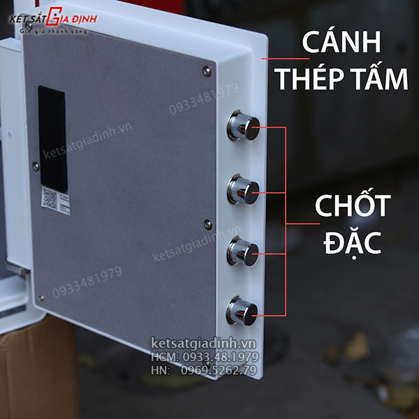 An toàn là yếu tố cốt lõi của HK-D45AM. Toàn bộ thân và cánh cửa két được chế tác từ thép nguyên tấm cao cấp. Vật liệu này mang lại độ bền vượt trội, tăng cường khả năng chống chịu trước các tác động cạy phá từ bên ngoài. Cánh cửa két được gia cố dày dặn, kết hợp với hệ thống 2 chốt khóa đặc chắc chắn, tạo nên một bức tường thép kiên cố bảo vệ tài sản bên trong.