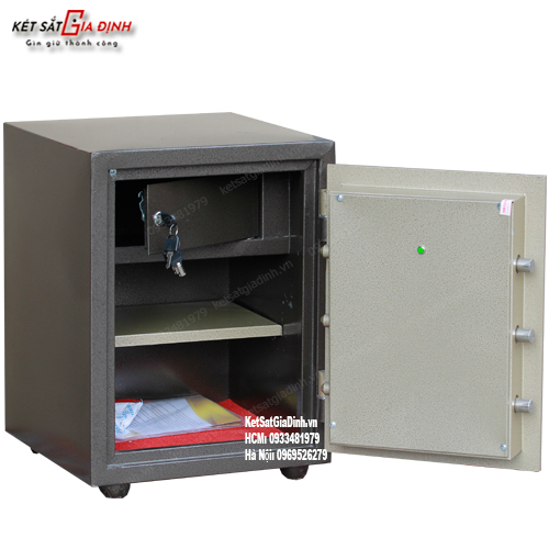 • Cách mở: xoay khóa chìa qua phải – bấm mở mã số – kéo tay nắm lên mở két.